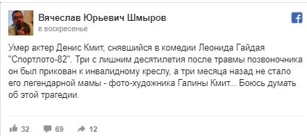 Помер радянський і російський актор Денис Кмит, який відомий по ролі в радянській комедії Спортлото- 82. Про це повідомив на своїй Facebook- сторінку кінопродюсер В'ячеслав Шмиров.