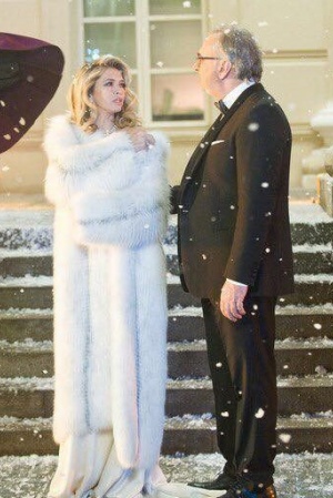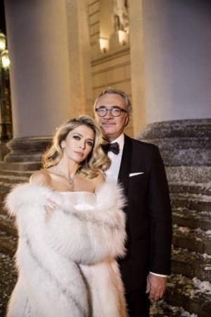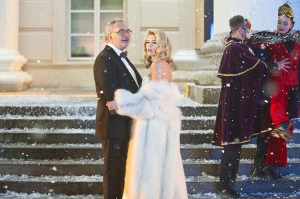 Брежнєва з'явилася у вечірній сукні з відкритою спиною і білій шубі, а Меладзе зафіксований в смокінгу. Свій ефектний і розкішний образ співачка доповнила дорогоцінним намистом.