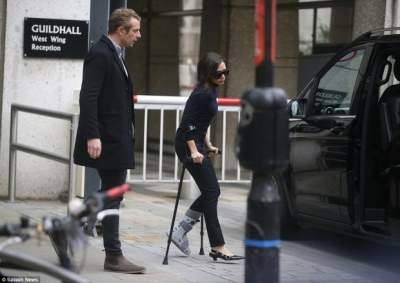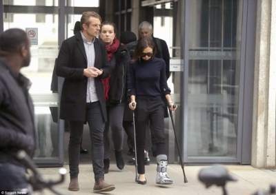 Журналісти упіймали перші кадри, як зірка виходила з приміщення на милицях і в спеціальному фіксаторі для ноги.