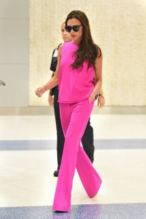 Успішна Вікторія Бекхем зуміла побудувати карколомну кар'єру в світі моди. І є найкращою моделлю для своїх нарядів. В яскраво рожевому брючному костюмі папараццы підловили 41-річну Вікторію в аеропорту Нью-Йорка.