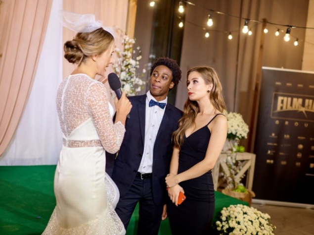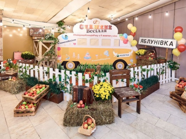 Соковиті яблука і святкові коктейлі, весільна арка, квіти, кульки, запальний діджей-сет і зйомки з дрона, спалахи камер і десятки коментарів для ЗМІ, величезний банер, 8 фотозон, справжнє офіційне весілля і боротьба за букет нареченої - так проходила зоряна прем'єра комедії "Скажене Весілля".