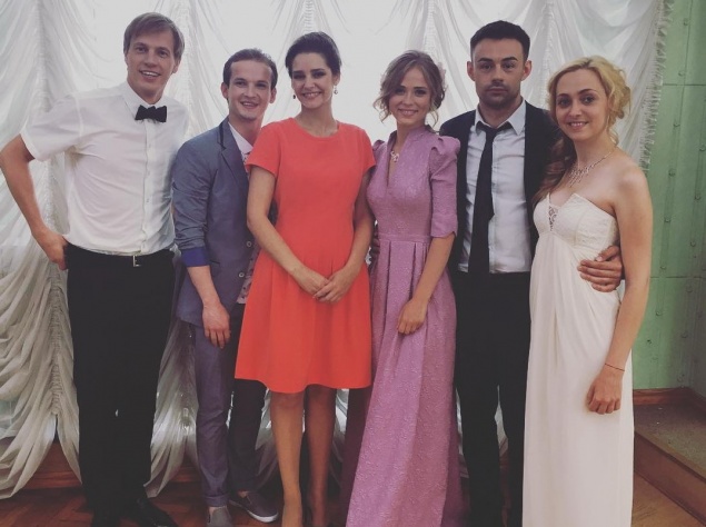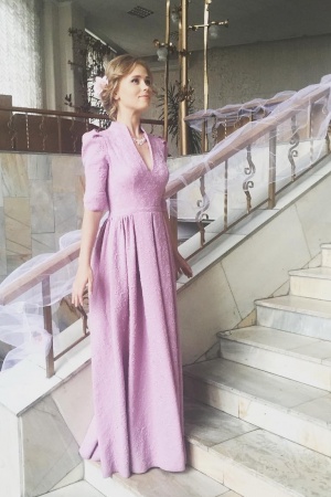 На знімках Ганна позує в компанії колег-акторів в ніжній ліловій сукні у Центральному Рагсі Києва.
