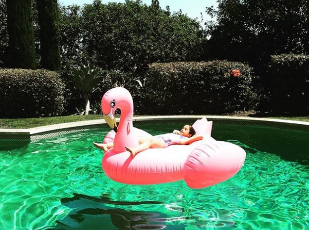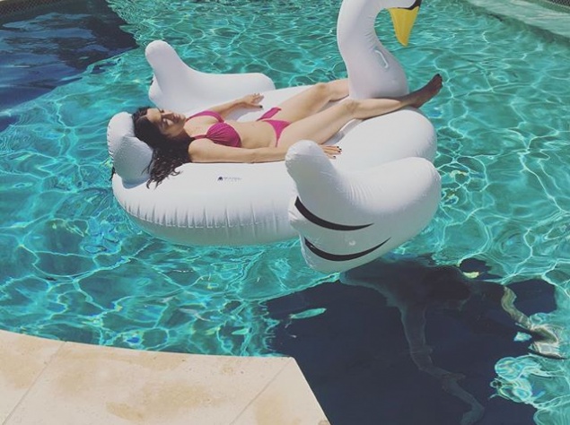 Так, на черговому знімку, який з'явився в мікроблозі Сальми, вона зображена в басейні, лежачи на модному в цьому сезоні колі у вигляді лебедя. Актриса позує в стильному рожевому бікіні, завдяки чому всім видно її ідеальні форми. До речі, раніше подібне фото вже з'являлося на сторінці Хайєк, тільки на ньому в купальнику позувала її дочка.